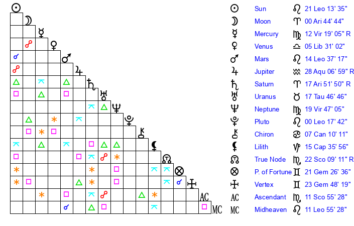 | Sun | 21 Leo 13 | 22 Leo 9 | 16 Scorpio 38 |