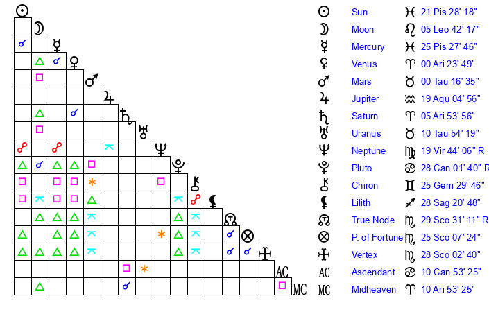 | Sun | 21 Pisces 28 | 22 Pisces 22 | 16 Gemini 16 |