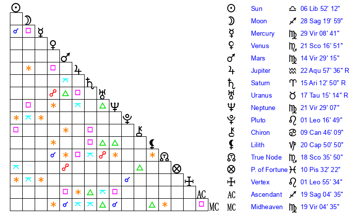 | Neptune | 21 Virgo 29 | 0 Aries 32 | 23 Virgo 20 |