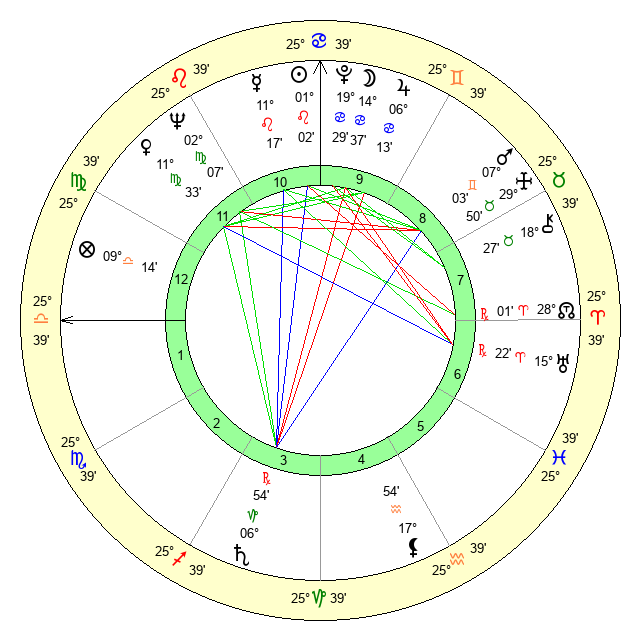 | Sun | 1 Leo 3 | 2 Leo 3 | 3 Scorpio 33 |