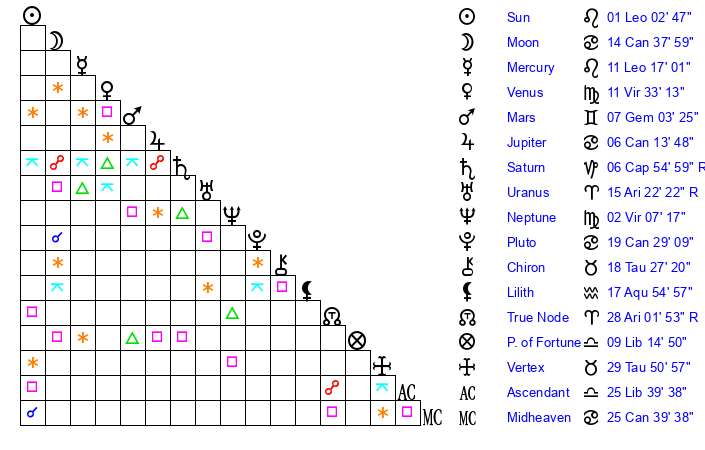 | Moon | 14 Cancer 36 | 0 Leo 46 | 15 Capricorn 1 |