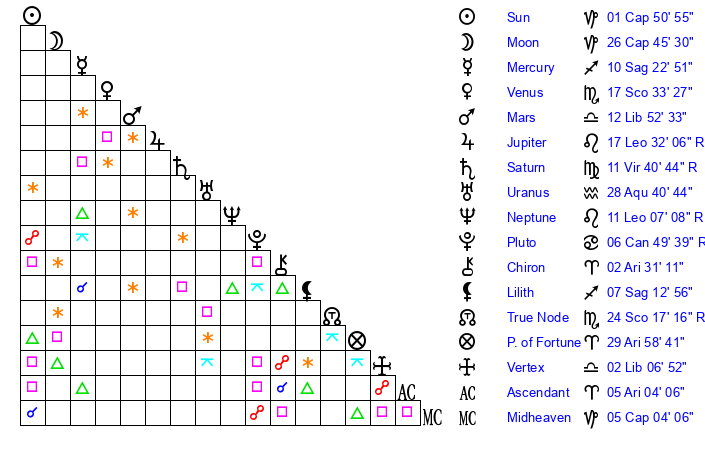| Moon | 26 Capricorn 50 | 25 Aquarius 42 | 17 Sagittarius 19 |