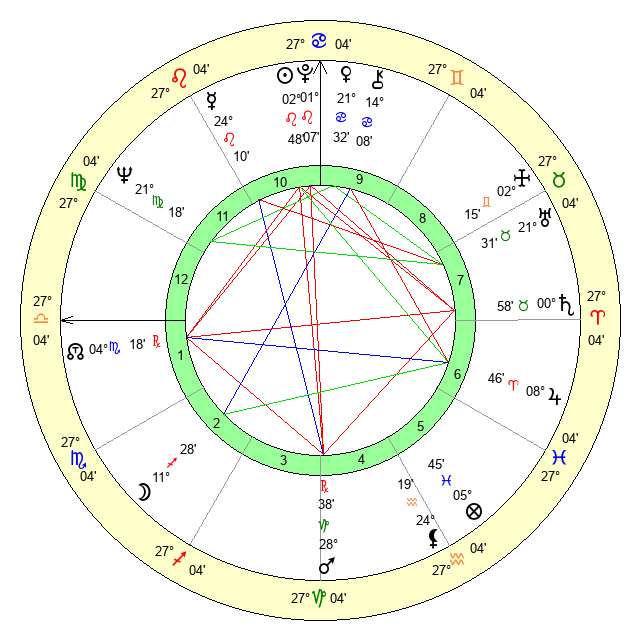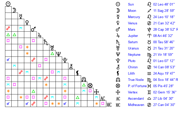 | Moon | 11 Sagittarius 28 | 27 Leo 48 | 2 Aquarius 50 |