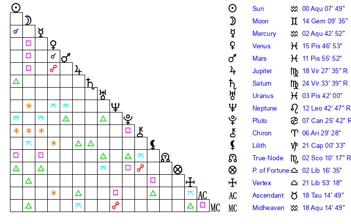 | Mercury | 2 Aquarius 43 | 18 Capricorn 16 | 6 Taurus 57 |