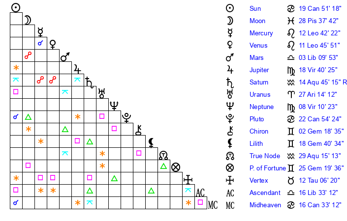 | Moon | 28 Pisces 42 | 12 Aquarius 59 | 29 Cancer 59 |