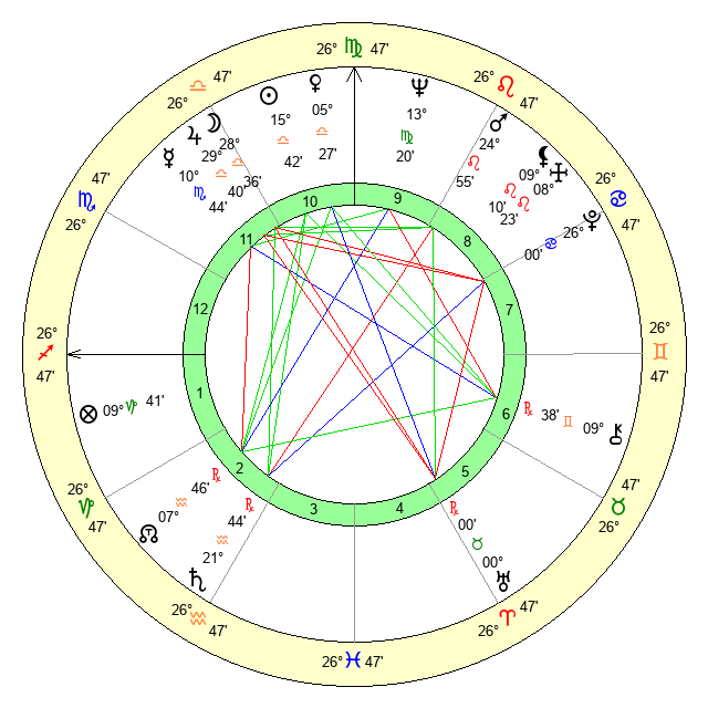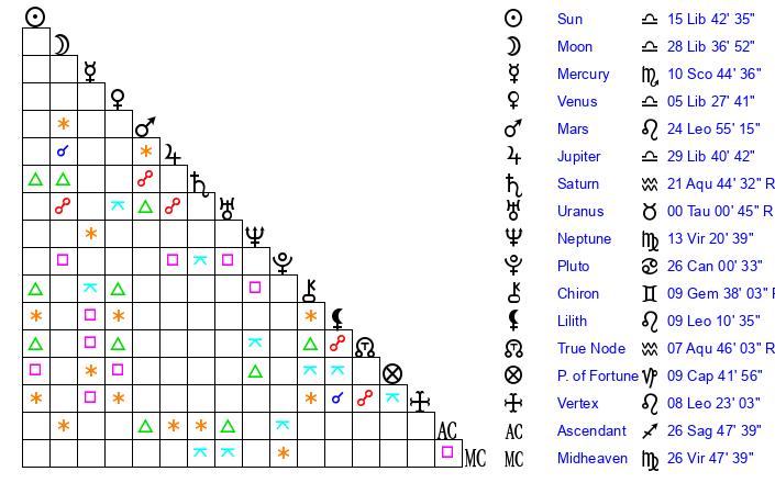 | Moon | 28 Libra 41 | 22 Taurus 10 | 5 Pisces 45 |