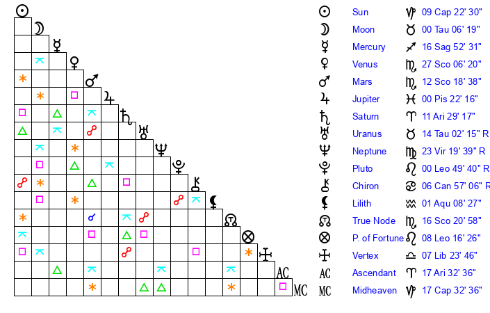 | Moon | 0 Taurus 10 | 19 Capricorn 58 | 25 Gemini 52 |