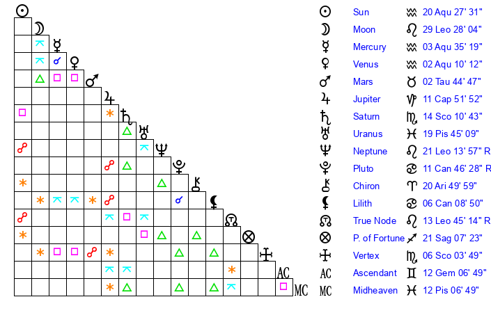 | Neptune | 21 Leo 13 | 28 Pisces 13 | 19 Leo 53 |