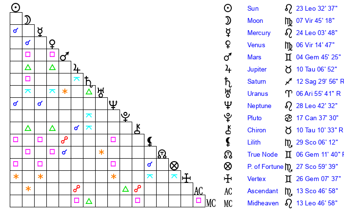 | Neptune | 28 Leo 43 | 1 Aries 42 | 1 Virgo 21 |