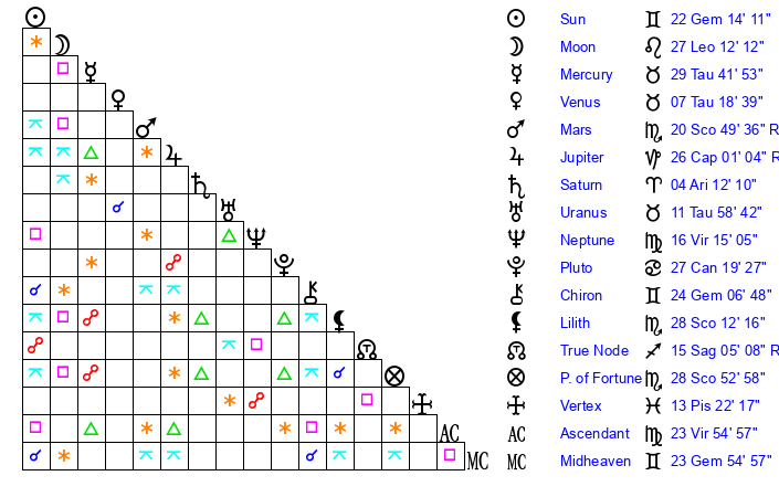 | Sun | 22 Gemini 14 | 22 Gemini 56 | 16 Virgo 34 |