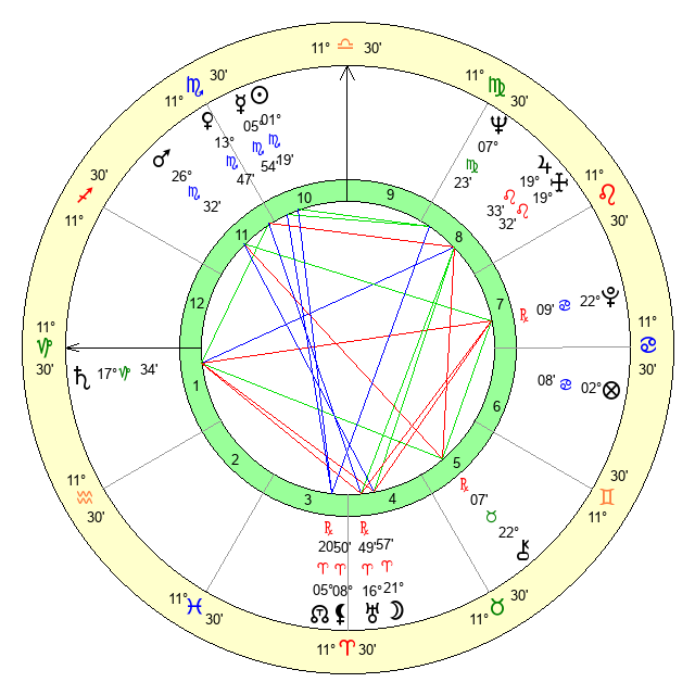 | Neptune | 7 Virgo 24 | 29 Pisces 54 | 7 Virgo 23 |