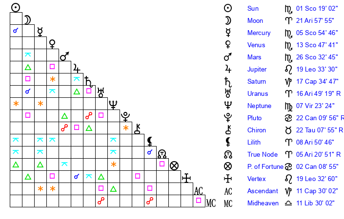 | Moon | 22 Aries 2 | 18 Sagittarius 11 | 0 Libra 57 |