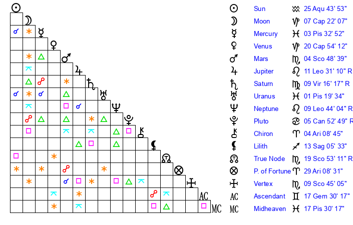 | Sun | 25 Aquarius 44 | 27 Aquarius 16 | 8 Gemini 56 |