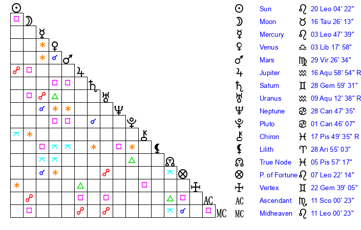 | Sun | 20 Leo 4 | 21 Leo 12 | 9 Sagittarius 41 |