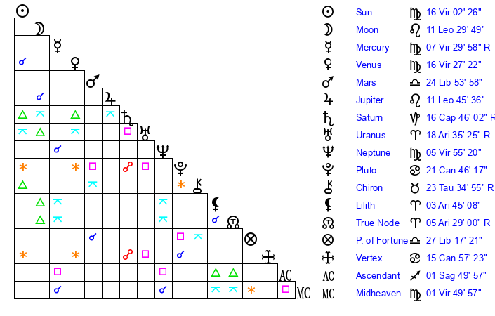 | Venus | 16 Virgo 28 | 18 Leo 3 | 13 Capricorn 41 |