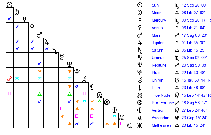 | Venus | 6 Libra 21 | 27 Libra 12 | 1 Sagittarius 48 |