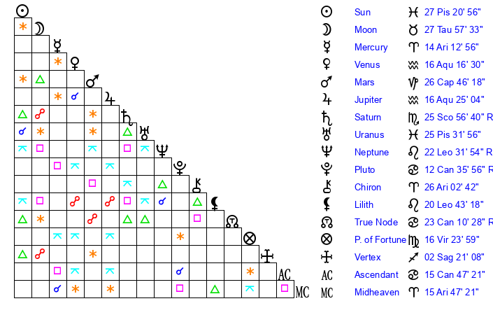 | Saturn | 26 Scorpio 27 | 22 Pisces 47 | 20 Scorpio 36 |