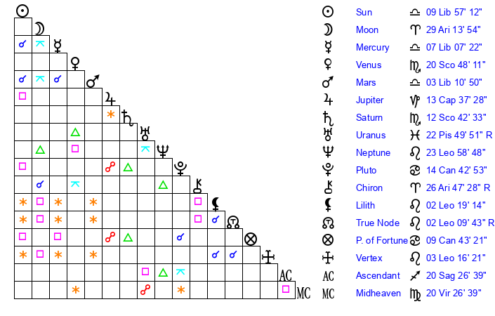 | Moon | 29 Aries 15 | 24 Aquarius 48 | 15 Sagittarius 21 |