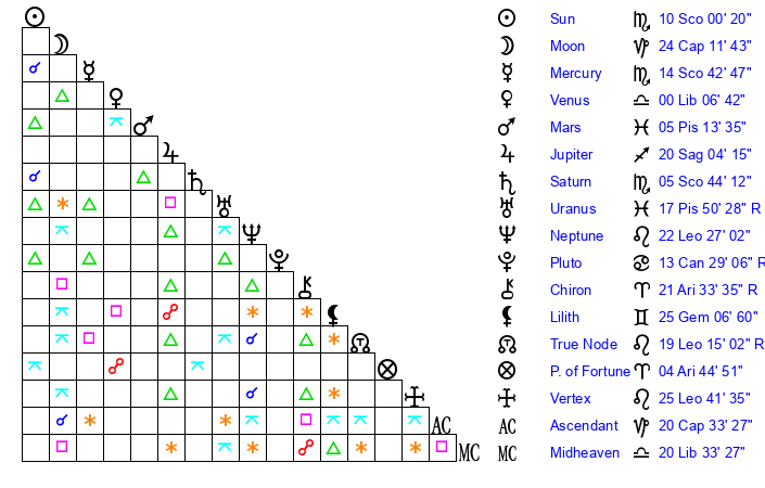 | Saturn | 6 Scorpio 15 | 25 Pisces 37 | 14 Scorpio 46 |