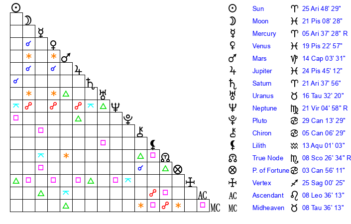 | Mercury | 5 Aries 36 | 0 Aries 19 | 14 Leo 54 |