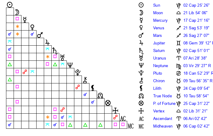 | Venus | 21 Sagittarius 54 | 19 Aquarius 46 | 20 Aries 50 |