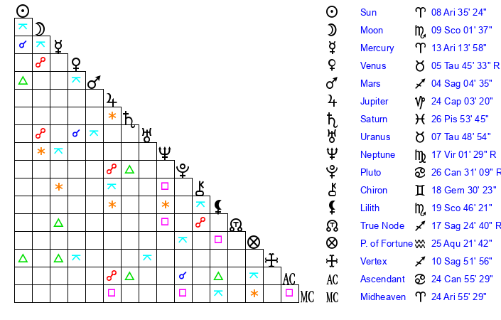 | Sun | 8 Aries 35 | 9 Aries 15 | 3 Cancer 41 |