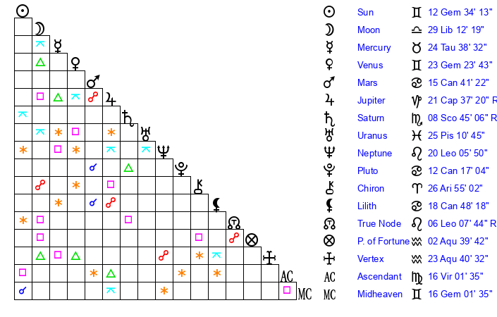 | Sun | 12 Gemini 34 | 13 Gemini 22 | 18 Virgo 25 |