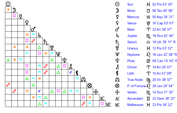 | Sun | 2 Pisces 3 | 3 Pisces 19 | 12 Gemini 5 |