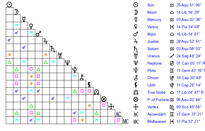| Sun | 25 Aquarius 51 | 27 Aquarius 16 | 25 Gemini 18 |