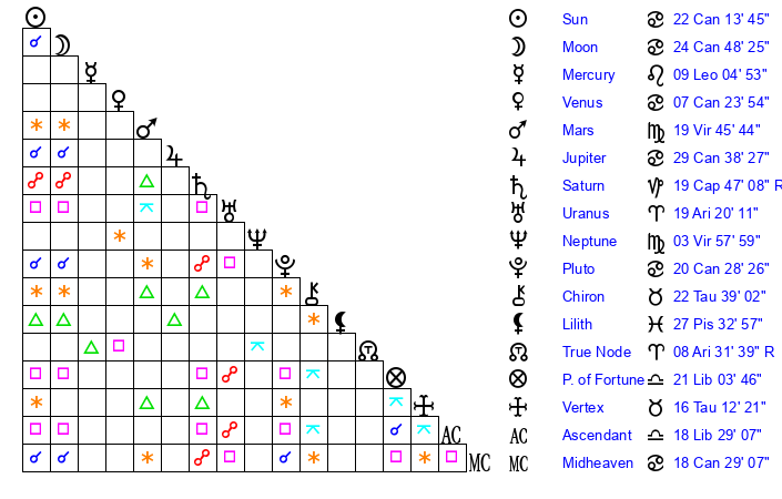 | Sun | 22 Cancer 14 | 23 Cancer 27 | 23 Libra 21 |