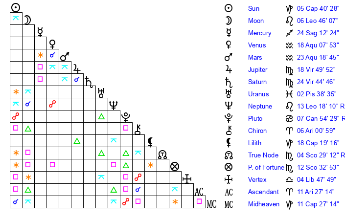| Neptune | 13 Leo 17 | 29 Pisces 27 | 10 Leo 59 |