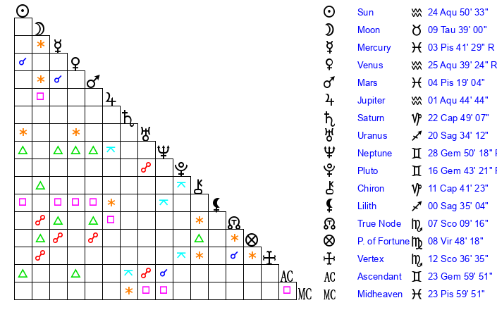 | Sun | 24 Aquarius 50 | 26 Aquarius 0 | 25 Gemini 18 |