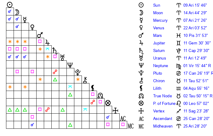 | Moon | 14 Aries 51 | 27 Aries 55 | 17 Libra 53 |
