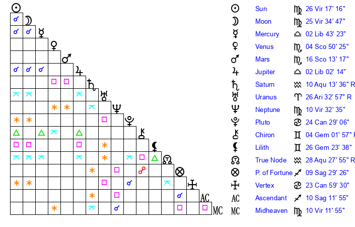 | Neptune | 10 Virgo 32 | 0 Aries 51 | 12 Virgo 22 |