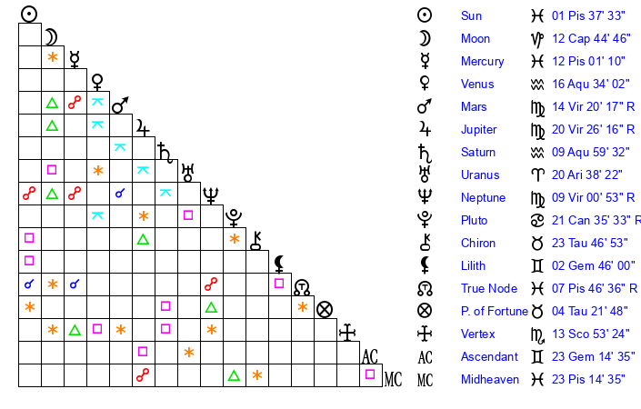 | Saturn | 10 Aquarius 10 | 19 Pisces 37 | 16 Aquarius 32 |