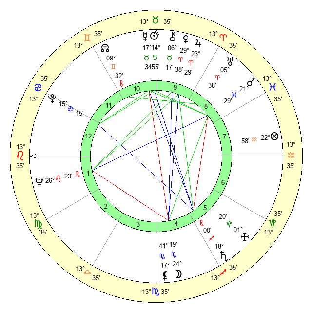 | Moon | 24 Scorpio 17 | 28 Leo 42 | 13 Gemini 53 |