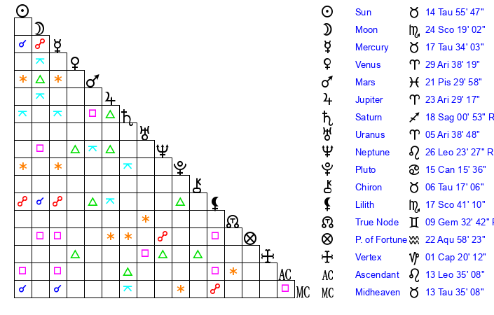| Sun | 14 Taurus 56 | 15 Taurus 27 | 17 Leo 47 |