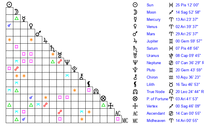 | Sun | 25 Pisces 12 | 26 Pisces 21 | 20 Cancer 21 |