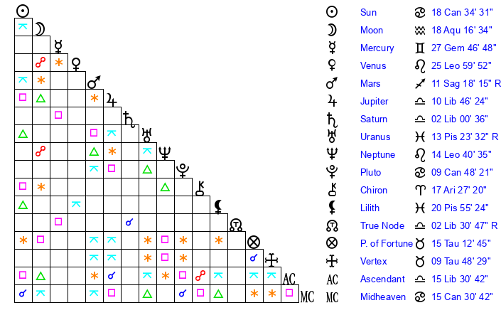 | Pluto | 9 Cancer 48 | 2 Aquarius 53 | 11 Cancer 11 |