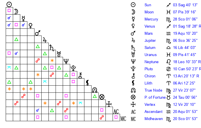 | Saturn | 17 Libra 20 | 25 Pisces 3 | 19 Libra 32 |