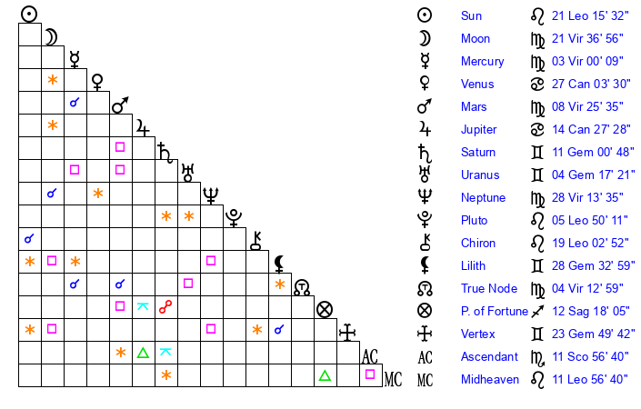 | Sun | 21 Leo 15 | 22 Leo 9 | 12 Scorpio 39 |