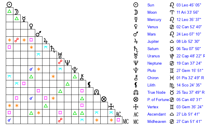 | Moon | 11 Aries 29 | 10 Virgo 48 | 4 Cancer 12 |