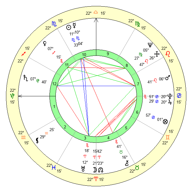 | Neptune | 5 Virgo 28 | 29 Pisces 42 | 4 Virgo 51 |