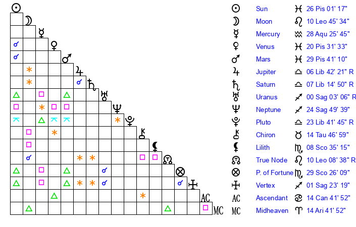 | Sun | 26 Pisces 1 | 26 Pisces 21 | 9 Taurus 17 |