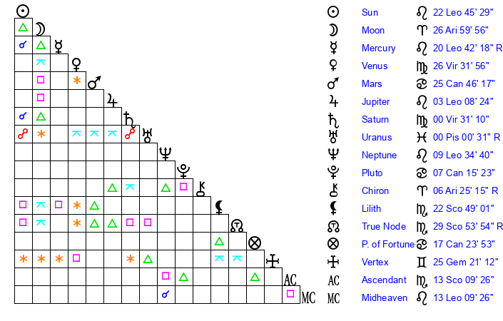 | Sun | 22 Leo 45 | 24 Leo 5 | 7 Sagittarius 26 |