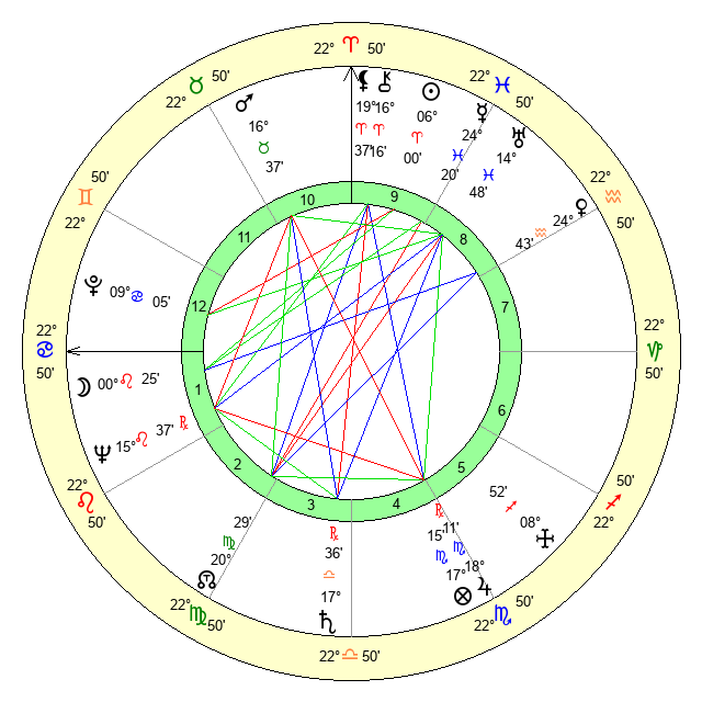 | Sun | 6 Aries 0 | 7 Aries 16 | 14 Cancer 32 |