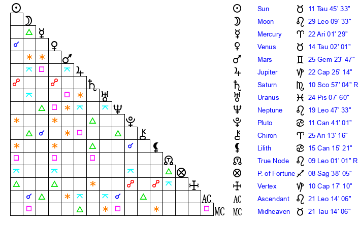| Sun | 11 Taurus 45 | 12 Taurus 32 | 17 Leo 31 |