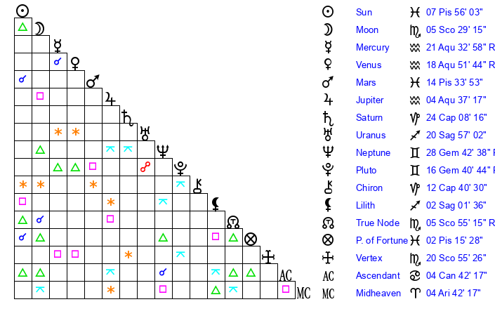 | Sun | 7 Pisces 56 | 9 Pisces 6 | 7 Cancer 42 |