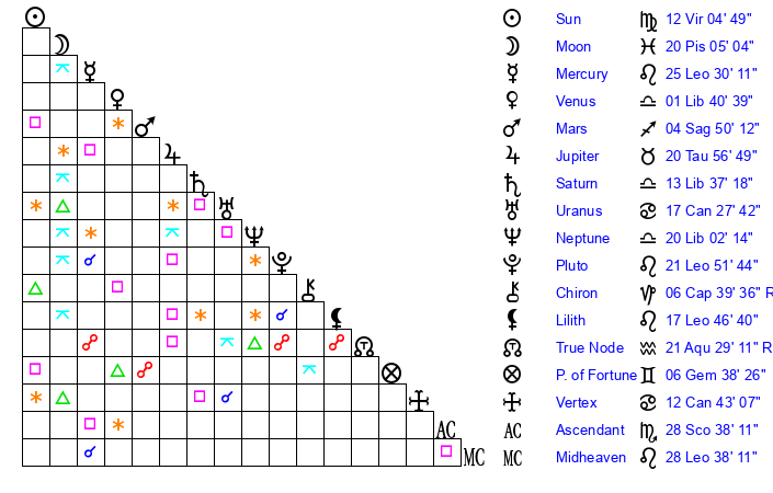 | Mercury | 25 Leo 30 | 4 Virgo 8 | 15 Sagittarius 36 |
