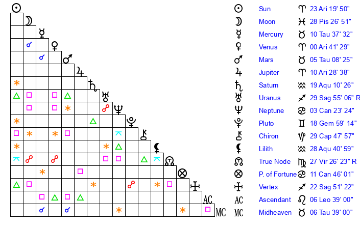 | Sun | 23 Aries 20 | 24 Aries 1 | 19 Leo 31 |